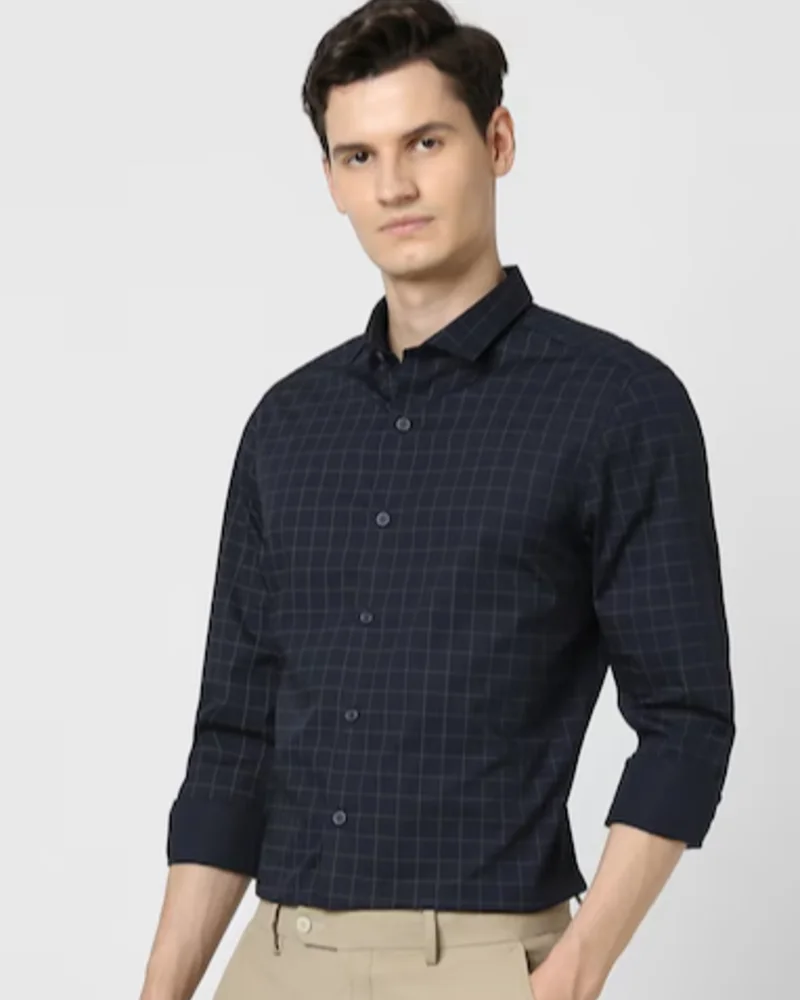 This Navy Check Formal shirt from Peter England Perform is tailored in slim-fit. Crafted in Cotton features a Regular Collar and Full Sleeves .